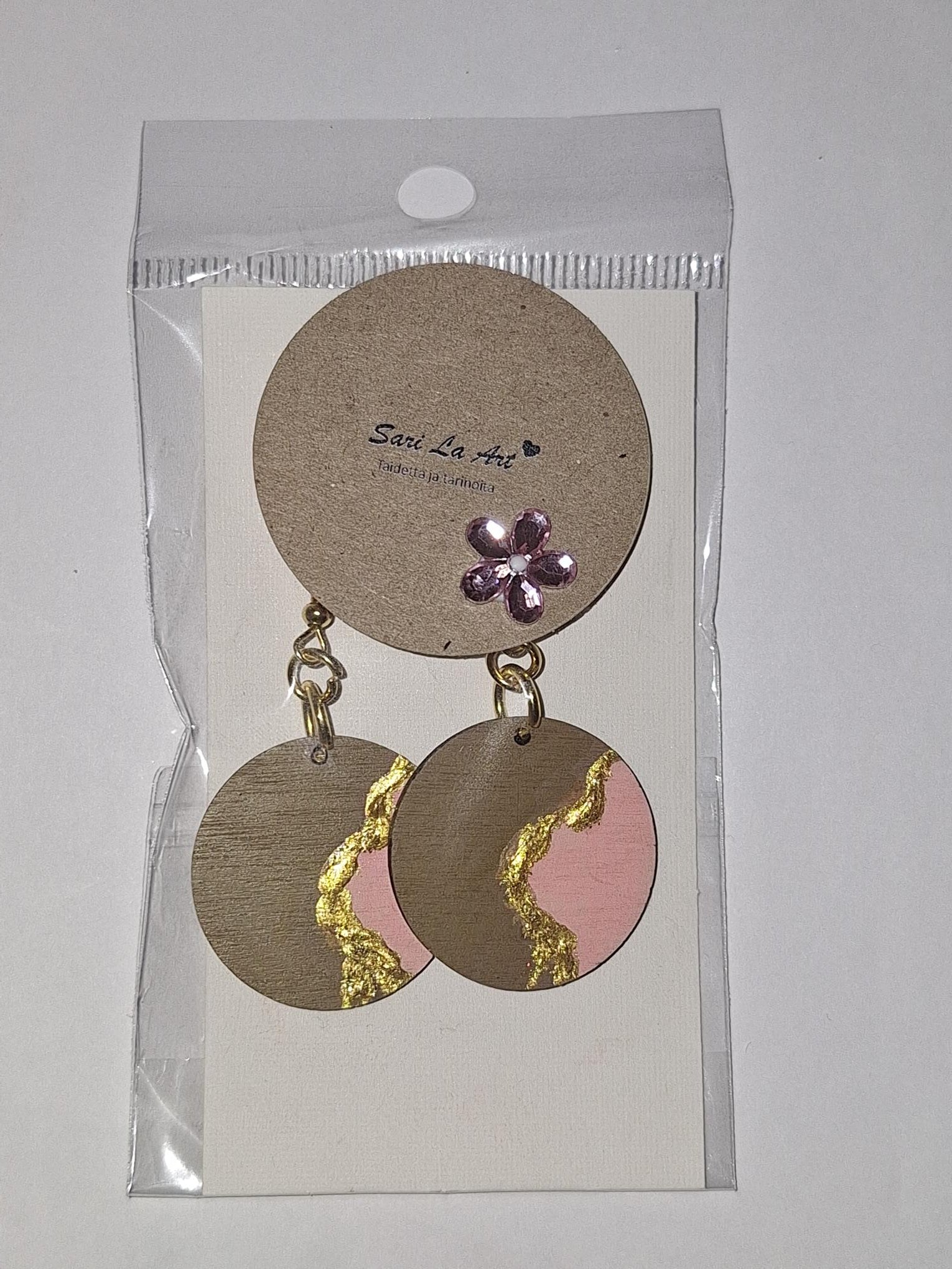 Nämä korut on käsinmaalattu akryyliväreillä suomalaiselle koivuvanerille. Korut ovat yksipuoleiset. Korun halkaisija on 2.7 cm ja ne ovat hyvin kevyet korvissa. Paino noin 3 grammaa per koru. Ei venytä korvanlehtiä.